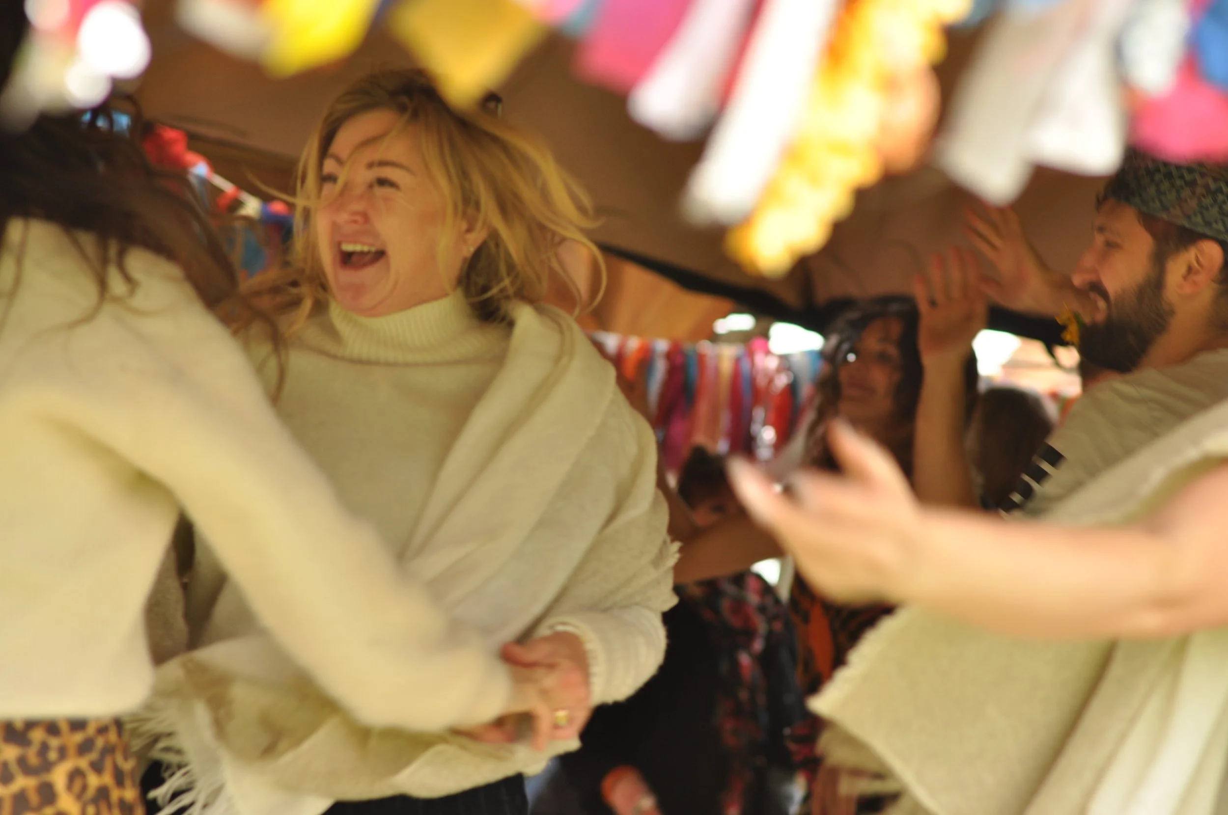 Dancing bridesmaids in the festival wedding barn